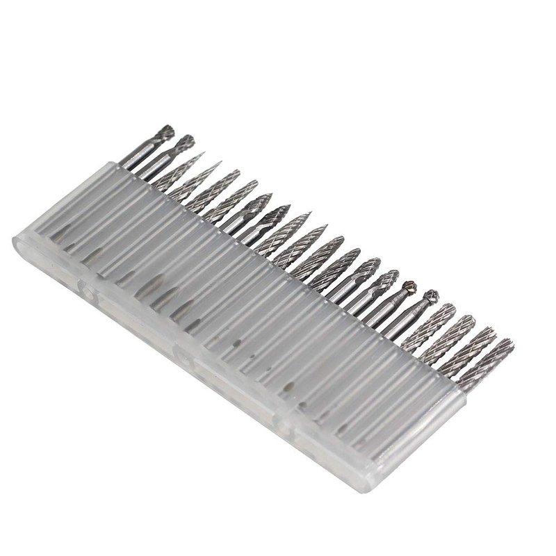 The JESTUOUS 20 Piece Double Cut Solid Carbide Rotary Burr Set includes 10 different type of assorted burrs.