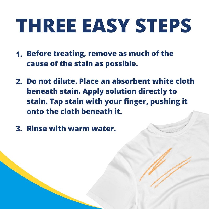 - DIRECTIONS: Before treating, remove as much of the cause of the stain as possible. Do not dilute. Place an absorbent white cloth beneath stain. Apply solution directly to stain. Tap stain with your finger, pushing it onto the cloth beneath it. Rinse with warm water.
