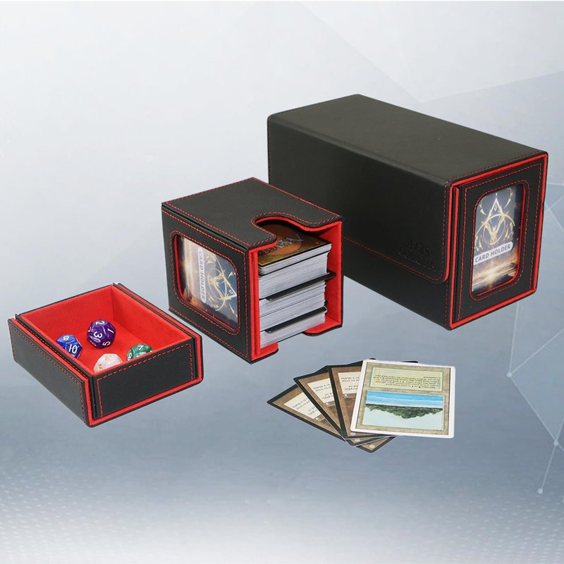 Card Deck Box for MTG, Commander Deck Case Fits 200+ Double-Sleeved Cards, 14 Magnets Leather Removable Card Storage Box with 2 Commander Display, 4 Dividers and Dice Tray fit TCG CCG,Black&Red