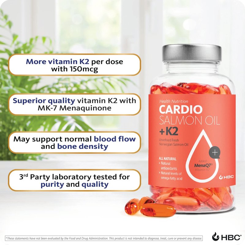 Cardio Triple Strength Omega 3 Fish Oil with Vitamin K2-1000mg, Norwegian Salmon Oil with EPA & DHA, Burpless Fish Oil, Omega 3 Fatty Acids Supplement for Eyes, Brain, Heart & Bones - 90 Capsules