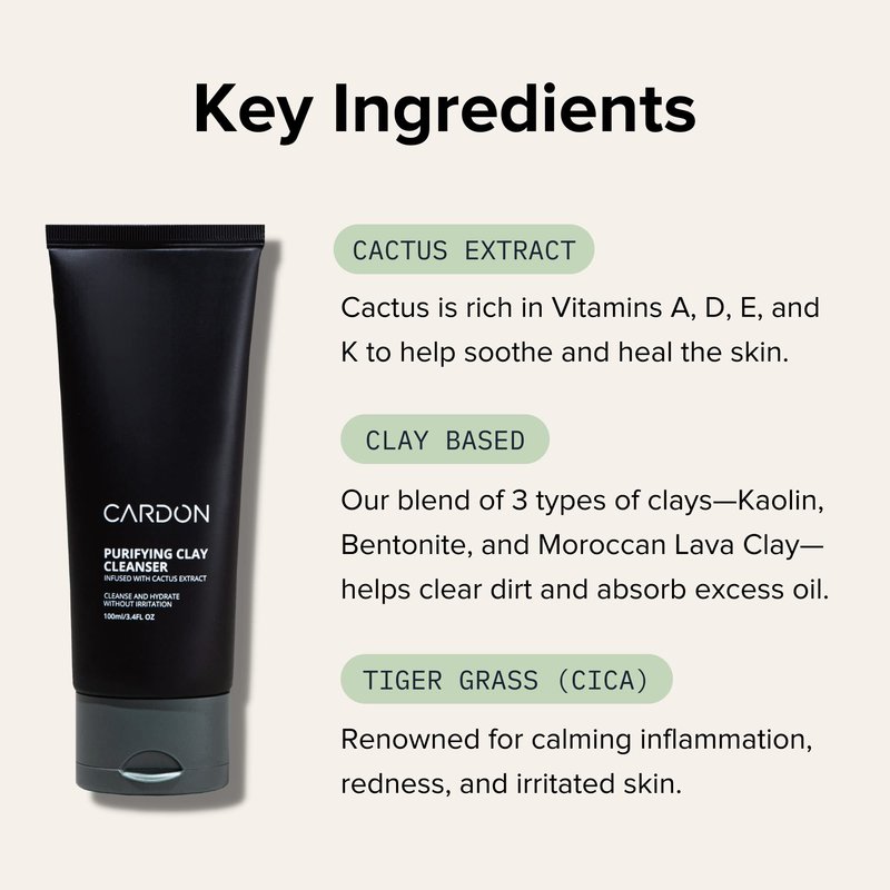 - NATURAL INGREDIENTS - Cardon products are made with CACTUS EXTRACT to soothe irritation from shaving and the sun. This mens face wash also contains clay (Kaolin, Bentonite, and Moroccan Lava Clay), and Centella Asiatica (cica), and vitamin E. Sulfate-free, paraben-free, silicone-free, and cruelty-free.