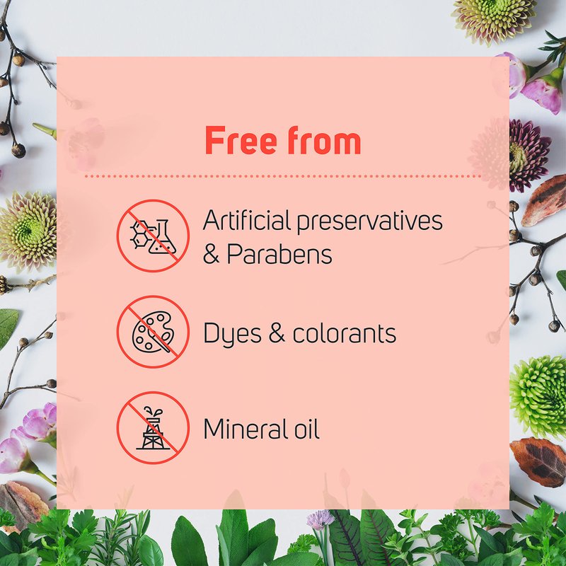- FREE FROM: No artificial preservatives, no dyes & colorants, no mineral oil, no parabens