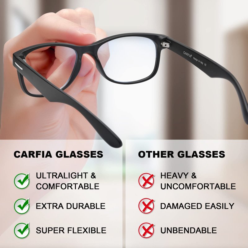 - Get the protection you need from harmful blue light from the Carfia glasses with blue light blocking lenses. They are meant for gamers, readers and everyday computer users. With the dual function, you can use them as daily readers while getting protection when you use screens.