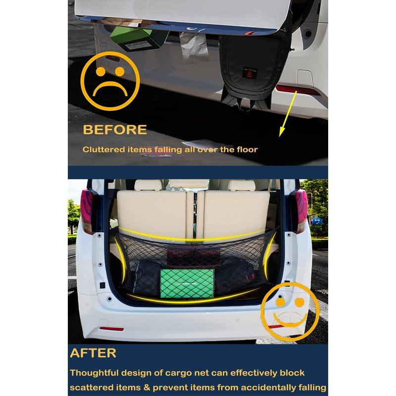 - 【Double-layer Enlarge Design】 The cargo network is not only in line with modern aesthetics, but also successfully makes it possible for double increase in storage space. Just put your irregular or small items in the middle of the double stretching. It is also possible to place large items behind the transport carriage and intercept them using the cargo network, which will effectively reduce the time you spend looking for dropped items, as well as eliminate the worry of dropped items.