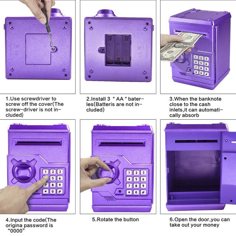 - 【Password protection】The piggy bank has a password-protected lock.The default password is 0000 ,you can change to another 4 digits password. If you Forgot your password, Please remove the battery and reinstall it after 5 minutes. The password will be restored to "0000".