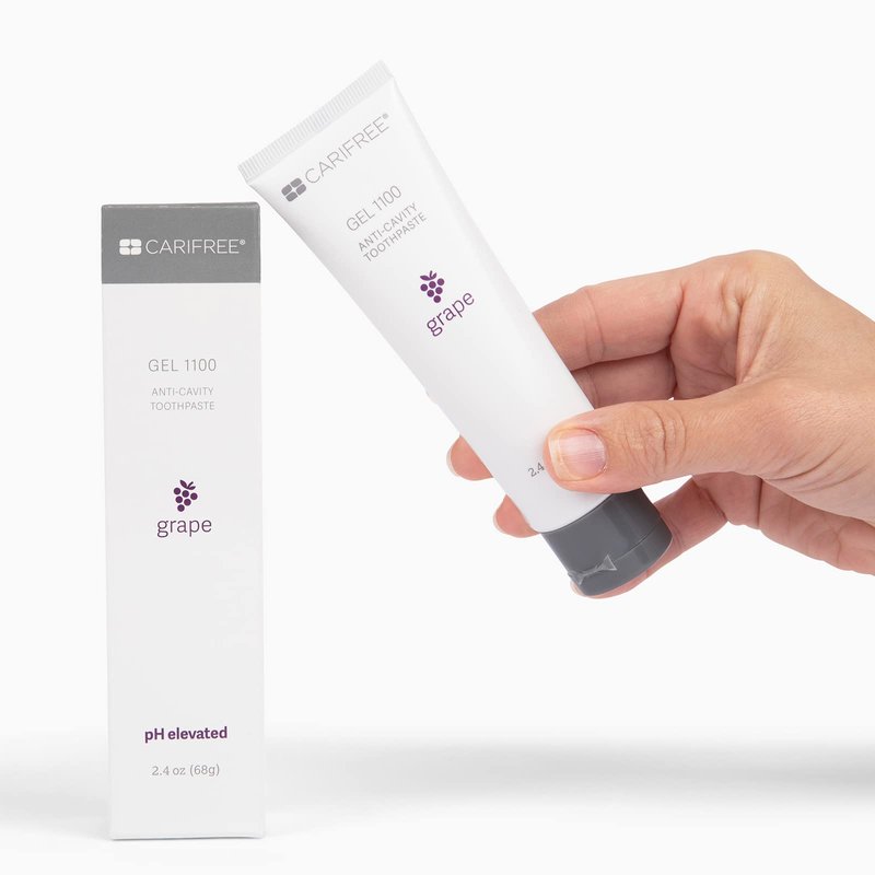 CariFree Gel 1100 is a low-abrasion tooth gel that combines the proven anti-caries benefits of .24% neutral sodium fluoride with bio-available nano hydroxyapatite crystallites, xylitol, and CariFree’s unique, patented pH+ technology. Each box contains one 2.4 fl oz tube. Approved size for airline travel! Approximately one month of use (when used twice daily).