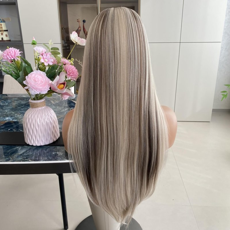 Carkira Ash Blonde Wigs with Brown Highlight Ombre Dark Root 13x6 Lace Front Wig Long Silk Straight Pre Plucked Synthetic Fiber Piano Color 24Inch for Women Girls