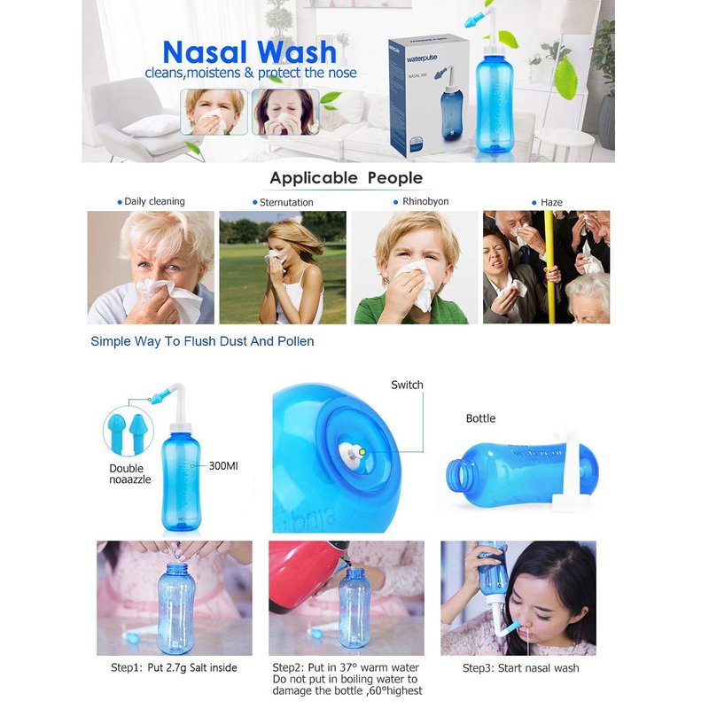 - SALINE NASAL IRRIGATION: This is a highly effective, easy to use nasal rinse device, helps to quickly soothe and relieve nasal symptoms and congestion associated with cold & flu, allergies, sinusitis, rhinitis, and dry air - it is a practical product for individual daily nasal care.