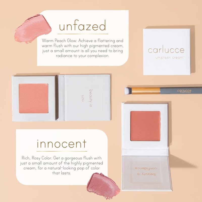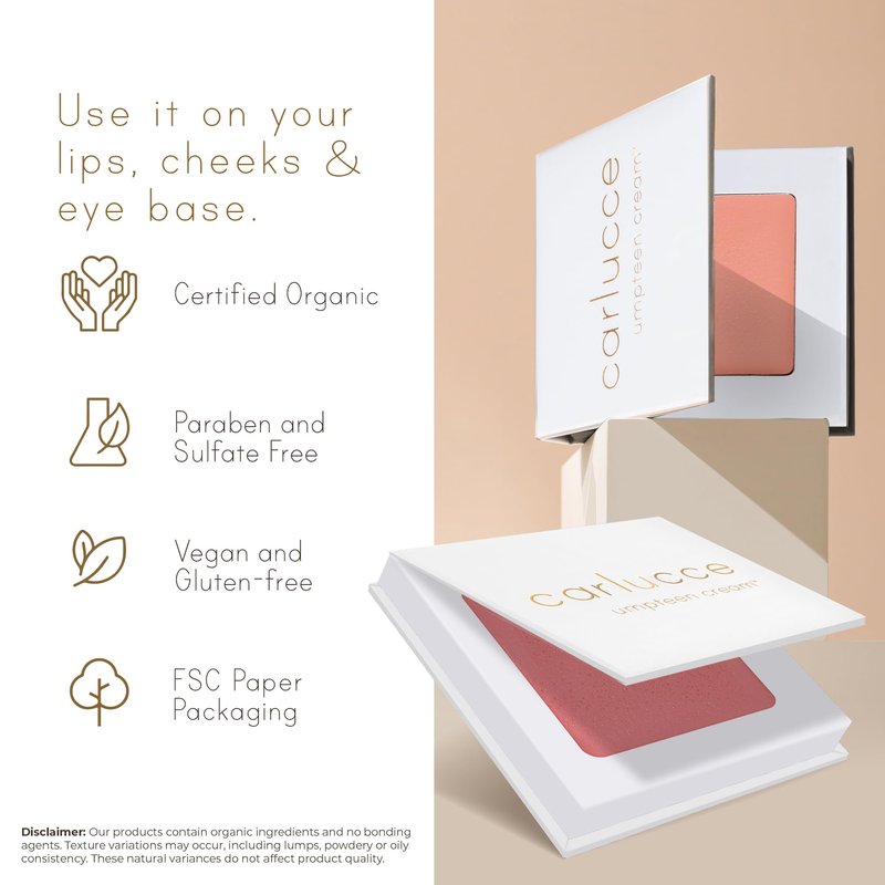 - The ultimate versatile cream: Carlucce Umpteen's 3-in-1 formula can be used on cheeks, lips, and as an eye base. The highly pigmented formula ensures that a small amount provides ample coverage. Vegan and natural, this cream adds both makeup and skincare benefits to your routine. Get a complete, natural look with just one product.
