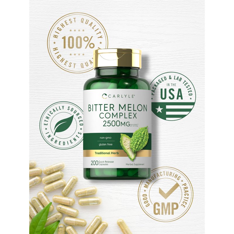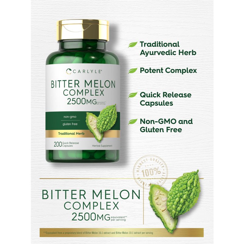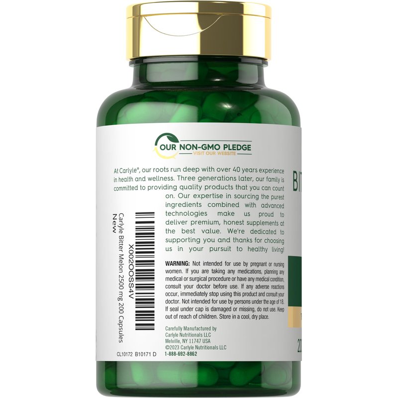 What is Bitter Melon? Bitter Melon, also known as bitter gourd or Momordica charantia, is a vine grown throughout tropical areas of the Amazon. This traditional herb is highly touted for its bitter fruit, which contains seeds and an abundance of naturally occurring phenolic plant compounds. You can now find Bitter Melon in forms like tea bags, juice, pills, tablets, capsules, gummies, liquid drops, dried herbs, and oils, as well as in skin care products like creams, soaps, face masks, and more. Carlyle Bitter Melon Complex: This traditional herbal supplement features a powerful complex that contains the equivalent of 2,500 mg of Bitter Melon fruit in a potent extract per serving.** Gluten free and non-GMO quick release capsules make it easy to receive this top source of Bitter Melon for daily support. Enjoy the benefits of this herb with our 200-capsule supply! Rooted In Wellness: Our expertise in sourcing the purest ingredients combined with advanced technologies makes us proud to deliver premium, honest supplements at the best value. Our premium Bitter Melon Complex is a testament to our commitment to excellence, made with powerful ingredients rooted in wellness. **Equivalent from a proprietary blend of Bitter Melon 16:1 extract and Bitter Melon 10:1 extract per serving