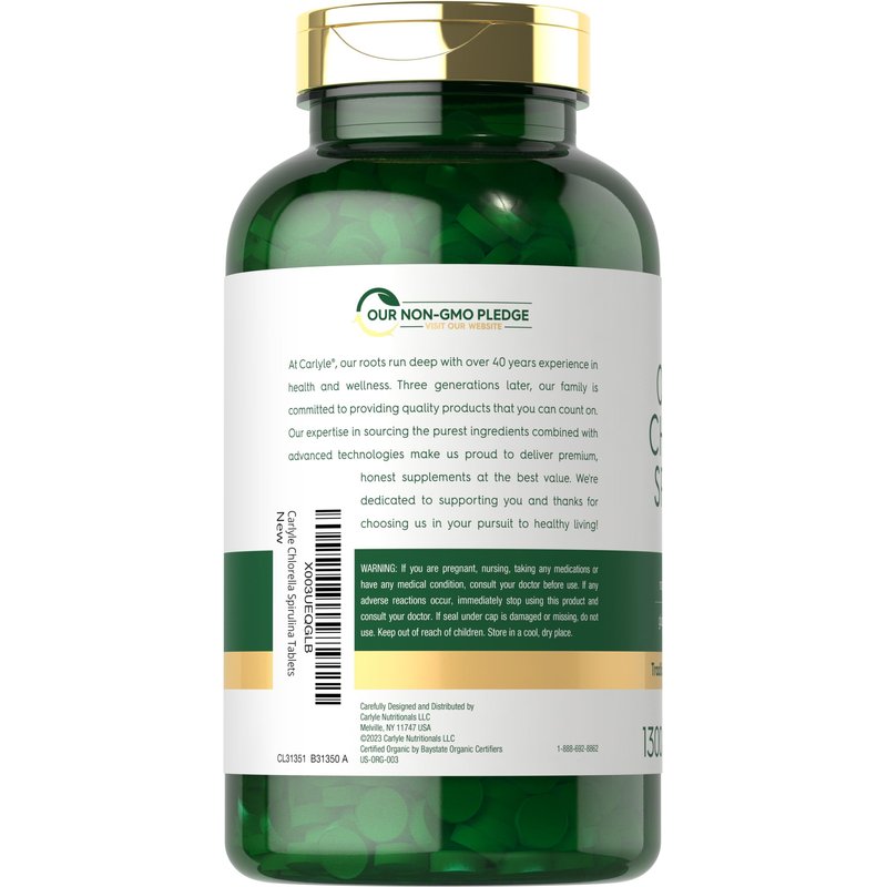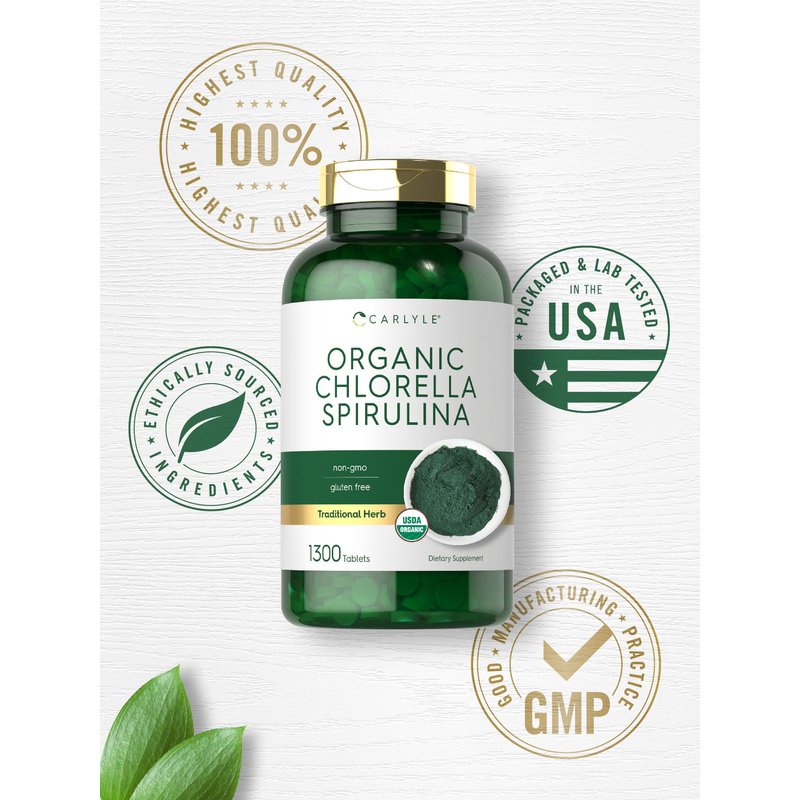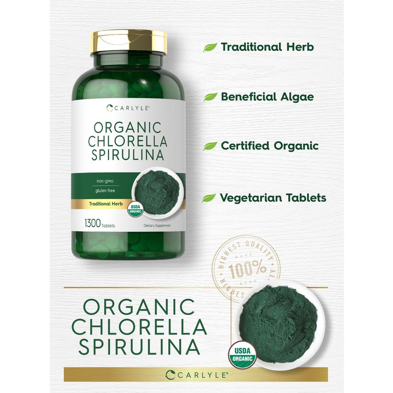 Carlyle Organic Chlorella Spirulina Tablets | 1300 Count | 50/50 Blend | Non-GMO and Gluten Free