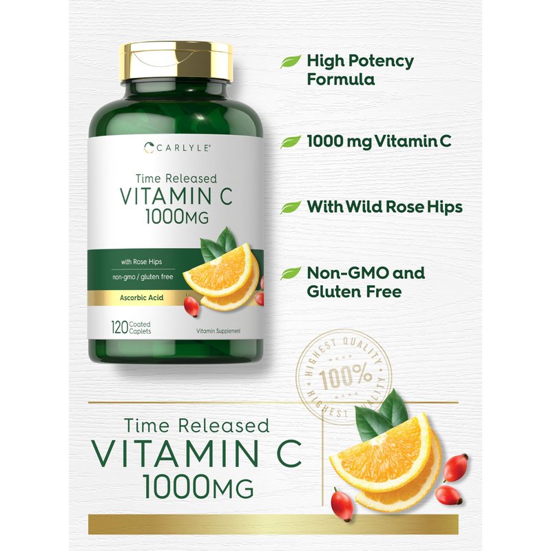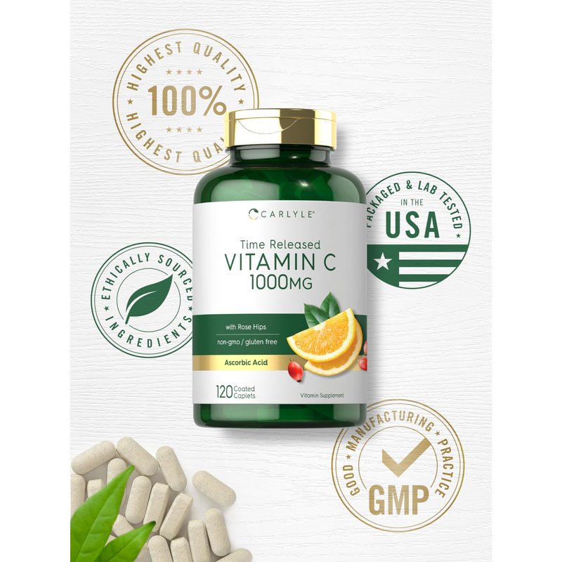 Carlyle Vitamin C 1000mg | Timed Release | 120 Vegetarian Caplets | with Rose HIPS | Non-GMO & Gluten Free Supplement
