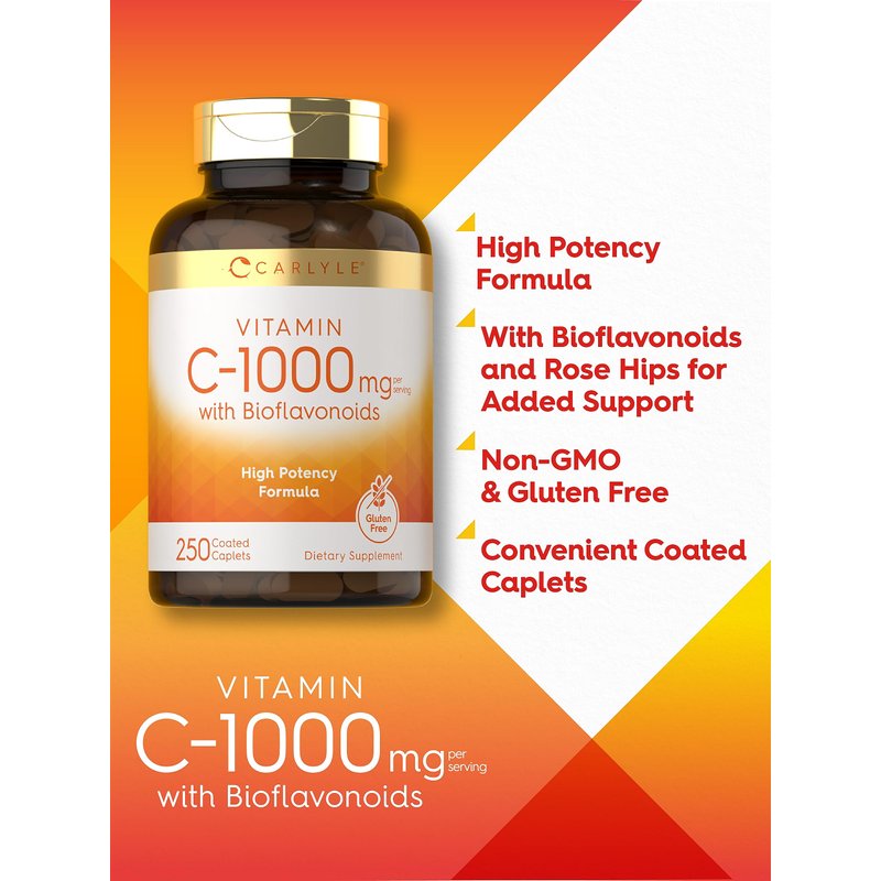 Carlyle Vitamin C 1000mg with Bioflavonoids | 250 Caplets | with Rose HIPS | Vegetarian, Non-GMO, Gluten Free