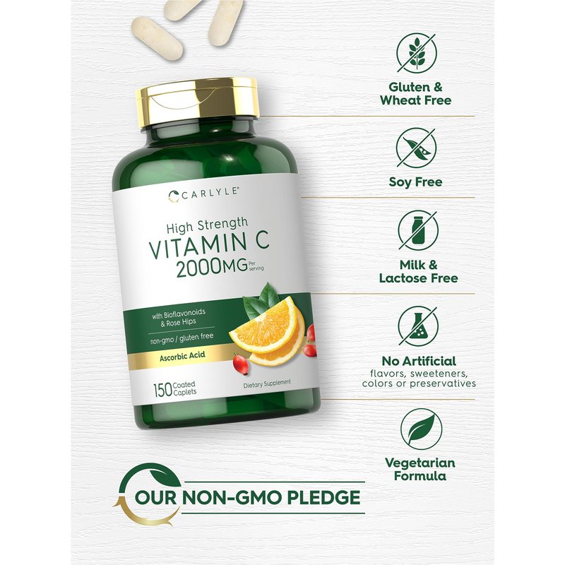 Carlyle Vitamin C 2000mg | with Rose HIPS | 150 Caplets | Vegetarian, Non-GMO, Gluten Free Supplement