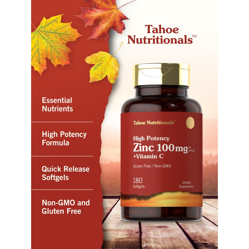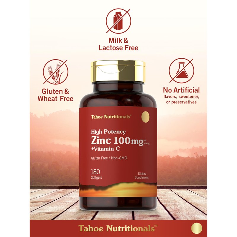 Carlyle Zinc Supplement 100mg with Vitamin C | 180 Softgels | Non-GMO, Gluten Free | Tahoe Nutritionals