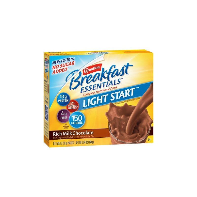 - Carnation Breakfast Essentials Light Start: The nutritional drink you love at breakfast, in a lower calorie option than the original, but the same convenient powder or bottled options