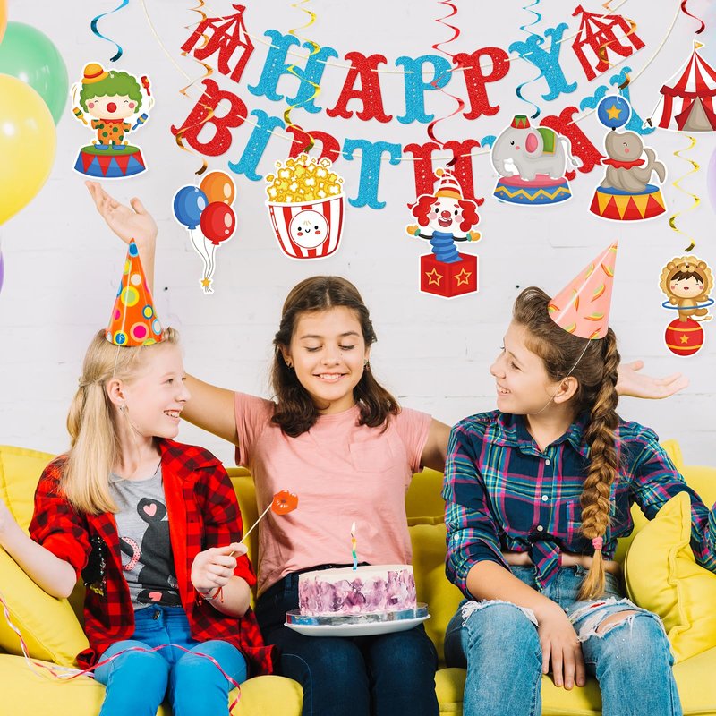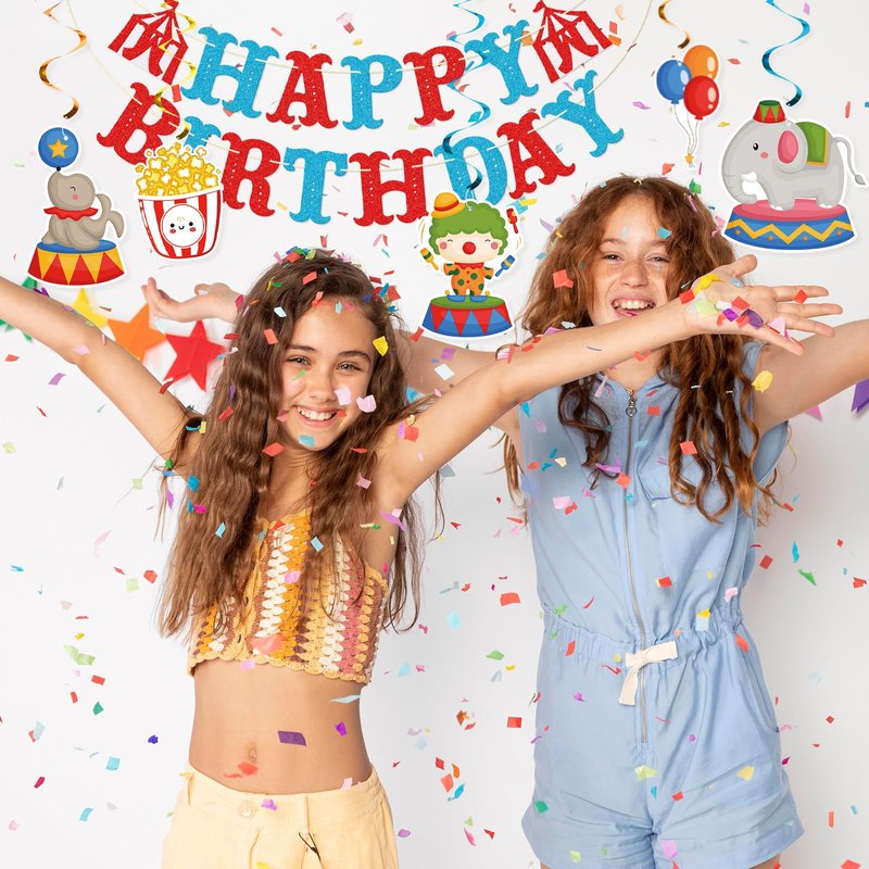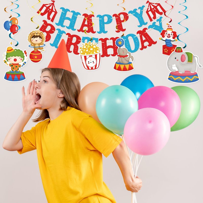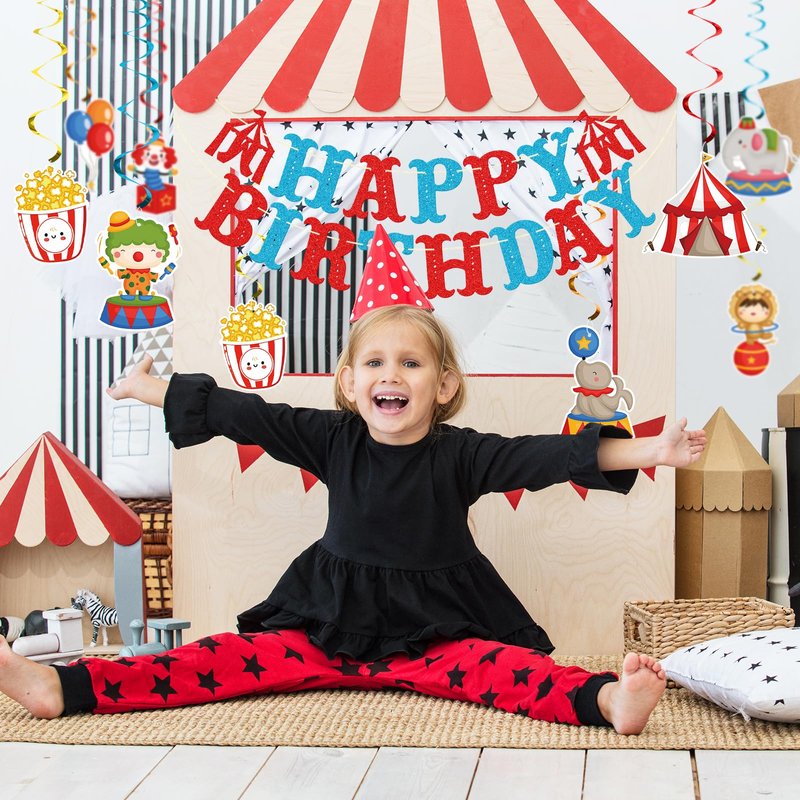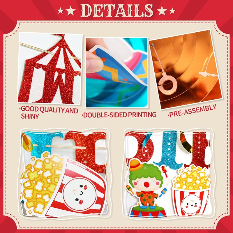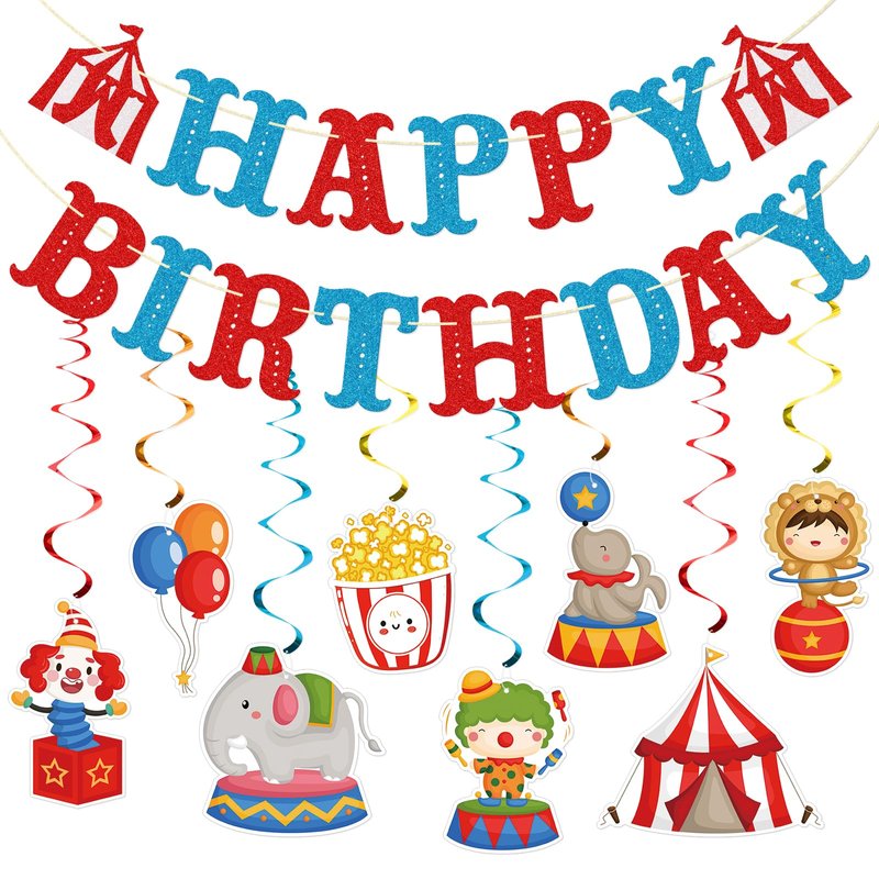 - PACKAGE INCLUDES: This exquisite set includes 1pc 'HAPPY BIRTHDAY' banner and 8pcs of carnival-themed hanging swirls, offering a vibrant, lively appeal. The carnival-themed decorations are full of adorable and lively carnival elements, injecting fun atmosphere in to the party
