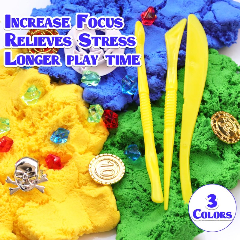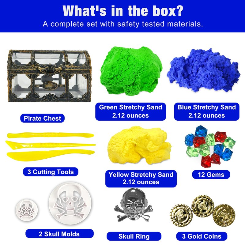 - PIRATE CHEST PLAYSET: Includes Reusable golden treasure chest,3 Packets stretchy sand (yellow,green and blue),gems,3 modeling clay tools,2 skull molds,Skull Ring,Gold Coins,Instruction sheet. Kids can create their own skull characters in the sand, then squish them and do it again! They can mix colored sand to get a new color. You can bury gems and coins in the sand and put them in the chest. Let them dig,pirate surprises to discover!