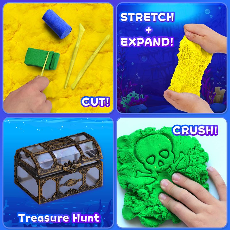 Carolart Pirate Stretchy Cloud Sand,Blue & Green & Yellow Play Sand,Treasure Chest with Sensory Sand,Stretchable,Moldable,Expandable Cloud Slime,Tactile Fun Sensory Kit, Sensory Toys for Kids Ages 3+