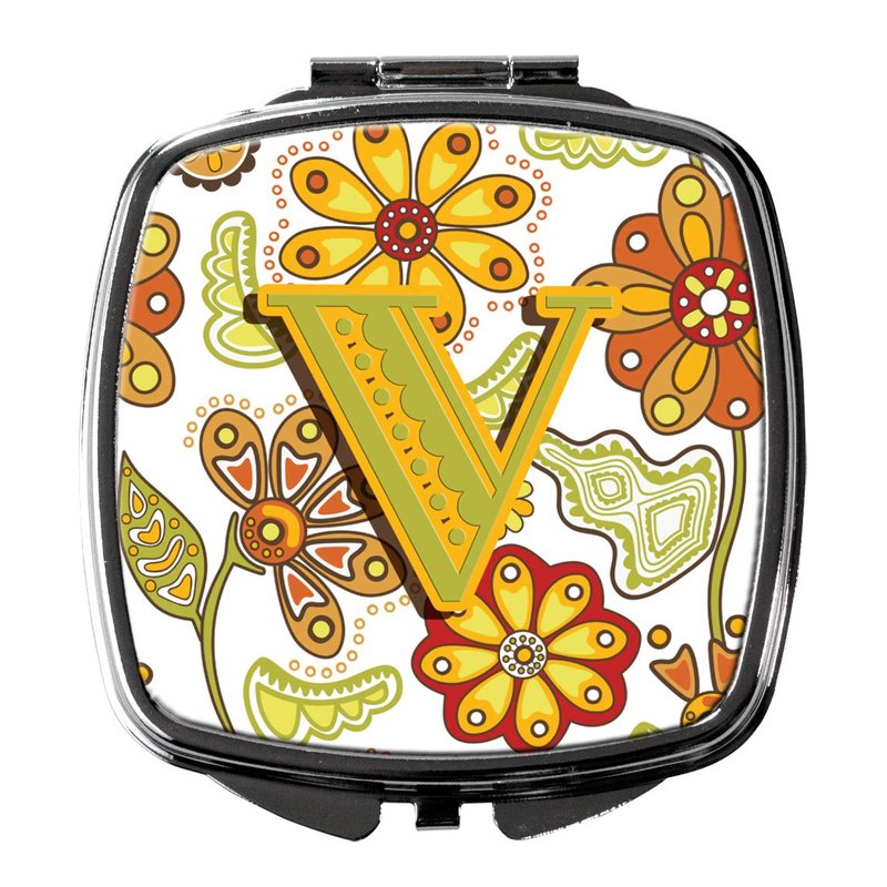 Caroline's Treasures CJ2003-VSCM Letter V Floral Mustard and Green Compact Mirror Decorative Travel Makeup Mirror for Women Girls Gifts Pocket Makeup Mirror Folding Handheld