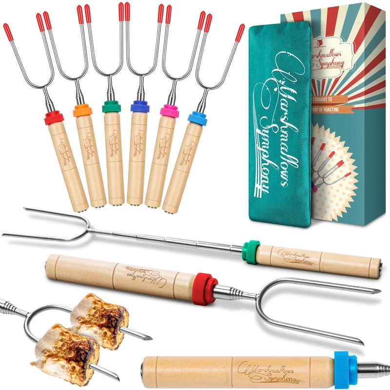 - 👪🏼 Glamping Party Supplies: Fun to use and Easy to Clean, this Premium, stainless steel expandable hot dog sticks for campfire will be a great addition to anyone’s glamping accessories. Kids have a blast using them! You'll get 6 marshmallow sticks, natural wood handles, 6 different vibrant color rings, tip protectors for safety, PLUS cute Storage Canvas Pouch & Roasting Guide FREE Ebook with Amazing Cooking Recipes. Who knew you could get so excited about smore sticks?