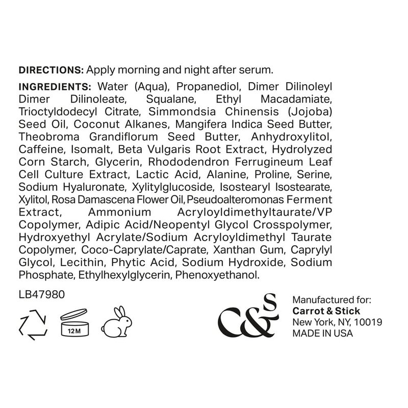 The lightweight antioxidant formula of The Moisturizer from Carrot & Stick is a hydrating powerhouse moisturizing cream that leaves skin feeling remarkably smooth and radiant. Overflowing with potent plant proteins, vitamins, peptides and amino-collagen, plus a stem cell extract from hardy alpine roses, it delivers multi-level hydration. Our active complex of three natural bio-ferments supports greater nutrient density and more efficient absorption. Caffeine adds an energy boost that revitalizes the skin, while five distinct coconut elements promote overall conditioning. Formulated with love for normal, dry, oily and combination skin.