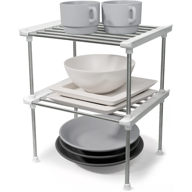 - Maximizes Space and is perfect for organizing plates, cups, bottles, and kitchen clutter. Creates storage space in your kitchen cabinets and countertop, bathroom and more.
