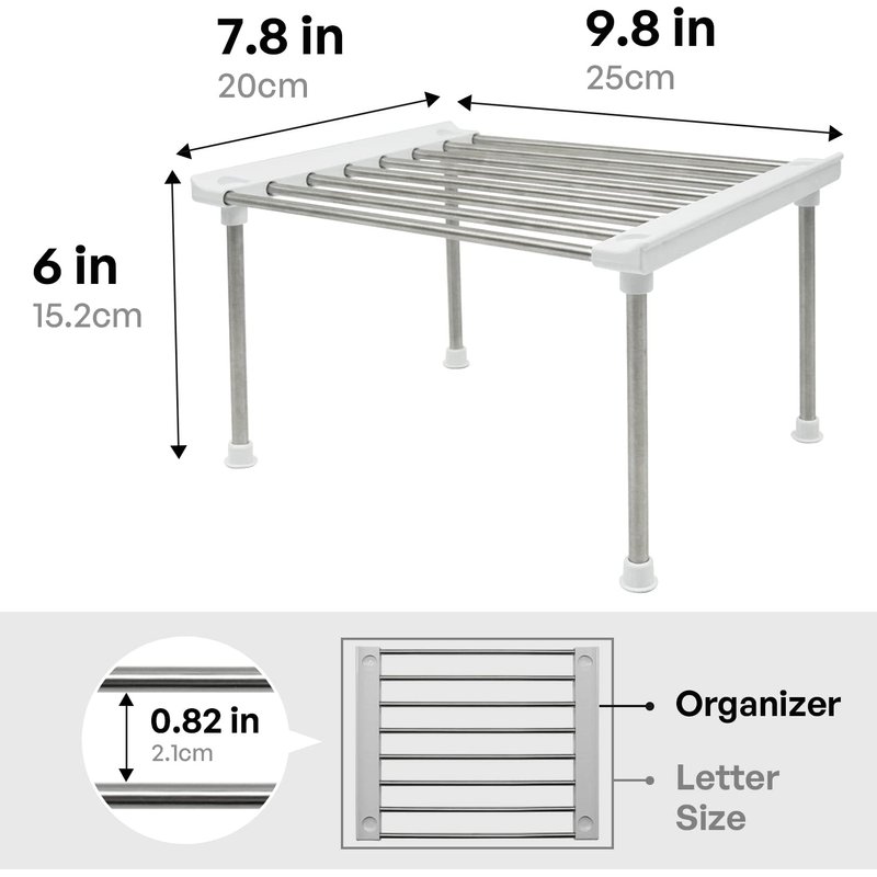· In the Kitchen: Put them in the cabinet or on the counter to create more levels and more stacking options for boxed grains, spice bottles, glasses, bowls and more. You can never have too many storage shelves in the kitchen, right?· In the Living Room: Create a neat coffee area with these shelves - coffee mugs under and teapot above. Your coffee gear will all find a place here.· In the Office: Stack the racks together on your desk to extend your space up. Organize your cup, stapler, clips and other everyday office supplies on different levels to restore a tidy desktop.