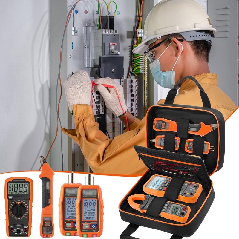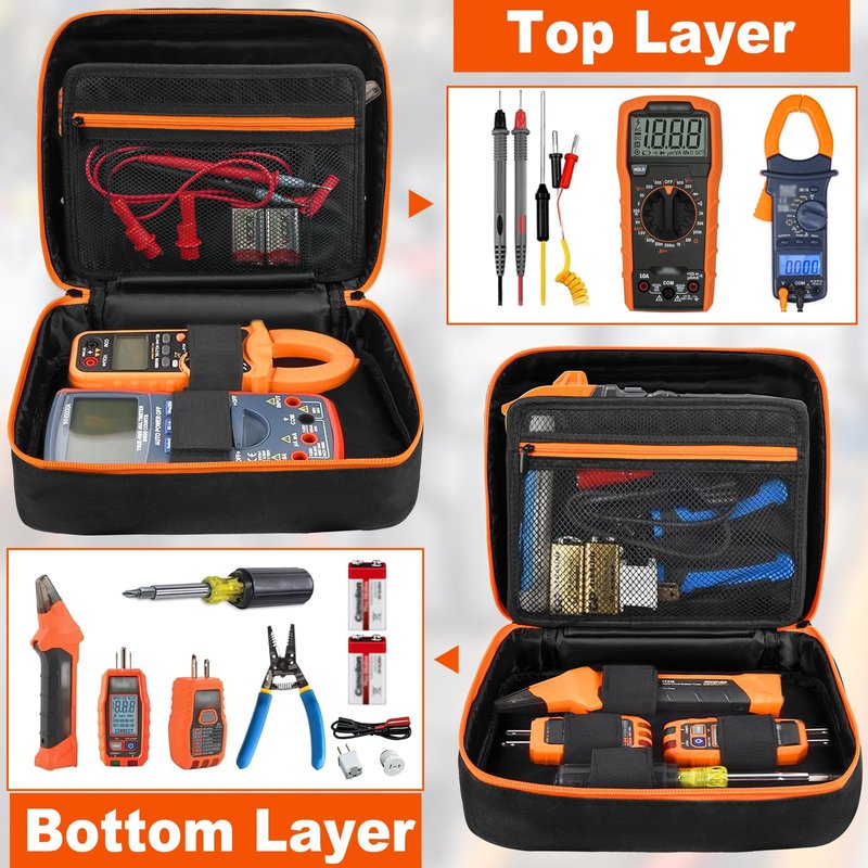 - Optimized Professional Storage: Top/bottom compartments securely store digital multimeters, clamp multimeters, socket testers, and voltage testers. The middle flap features two dual-access mesh zipper pockets, organizing multimeter test leads, batteries, and adapters with tangle-free convenience. Say goodbye to wire chaos in your electrical tool bag