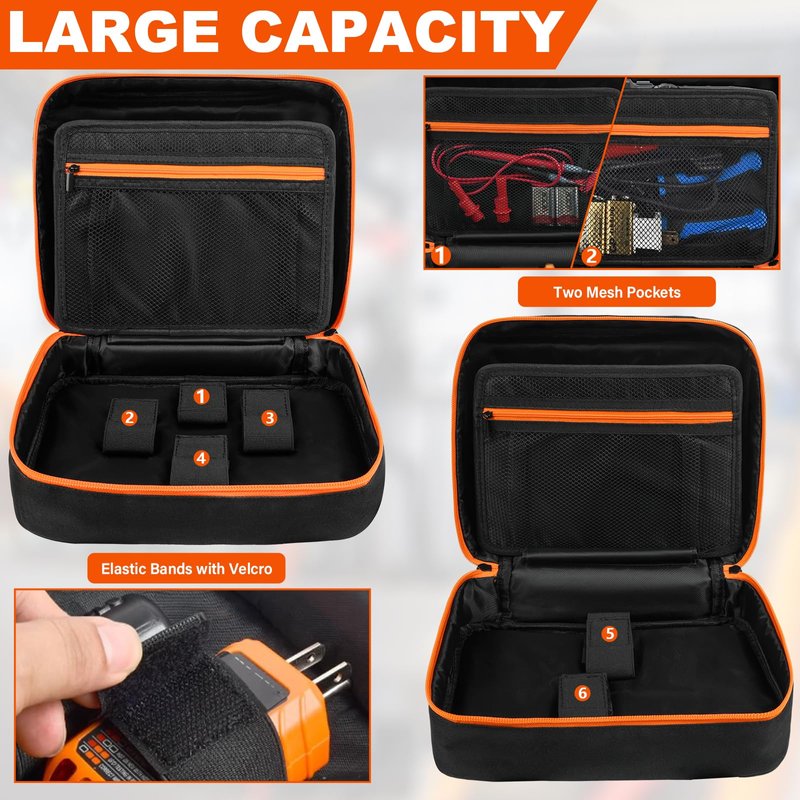 - 6-Point Secure Strapping System: Features 6 adjustable hook-and-loop elastic straps in the main compartment, firmly securing digital multimeters, clamp meters, NCV testers, insulated tools, and compatible with Klein circuit breaker finders. Prevents slippage even when fully opened – ideal for electricians on the move