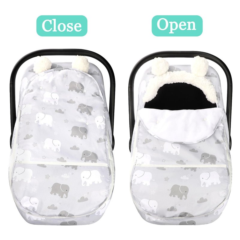 WARM & COZY: This car seat cover is the perfect way to keep your little ones warm and cozy all winter long. Protect your child from wind, snow and ice. SOFT & COMFORTABLE FABRICS:The baby carseat covers are made of high quantity fabrics. The inner fleece helps keep warm and your baby will be more comfortable.The head opening in the top allows for your baby to look out at the world around him. EASY ACCESS : The elastic edge design fits most standard size stroller seats and does not hinder the car seat's ability to latch into it's base. Easy to install and remove. EASY CARE : Do not let stains set. Machine wash warm or cold with like colors on gentle cycle. SHOWER GIFT:The Baby Car Seat Cover will make a perfect baby shower gift! The Carseat Canopy can also be used with our Elephant-themed Carseat insert, Minky Blanket, Crib sheet , Nursing pillow covers etc.
