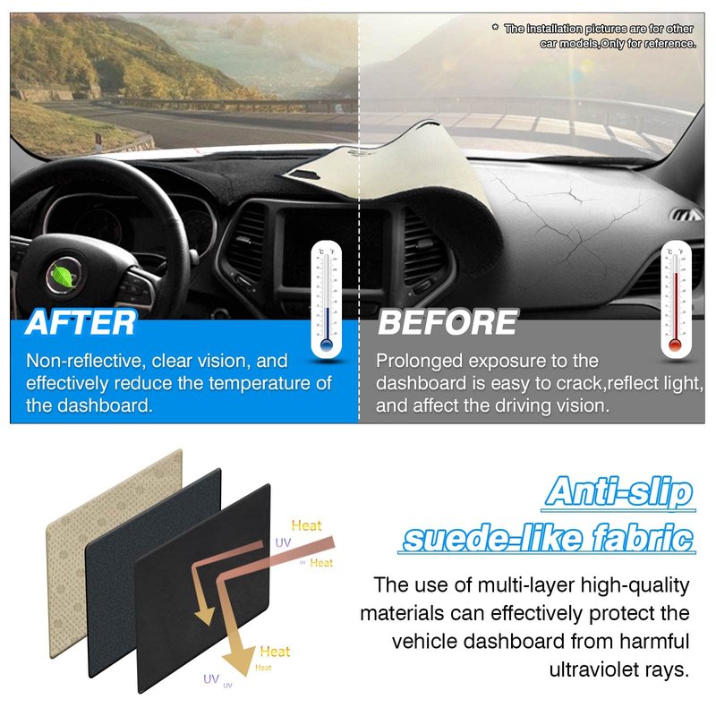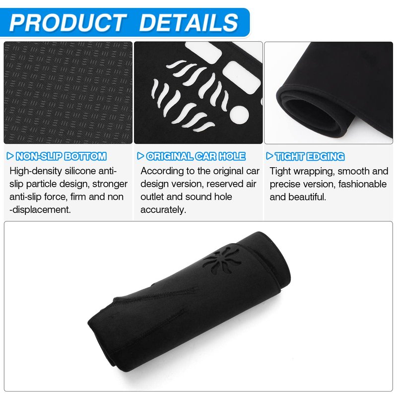 - Easy installation -- The dashmat comes all vents & sensors pre-cut, with anti-slip silicone on back. You just need to clean the dashboard and fix the cover with stick tape. No worrying about slipping.