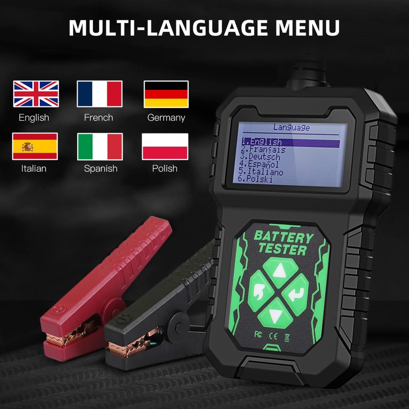 - Multilingual Battery Testing - Our Battery Testers support six different languages, including English, French, German, Italian, Spanish, and Polish. Whether you're a professional mechanic or a car enthusiast, using our battery analyzer gives you the ability to test your car battery at any time and in any language.