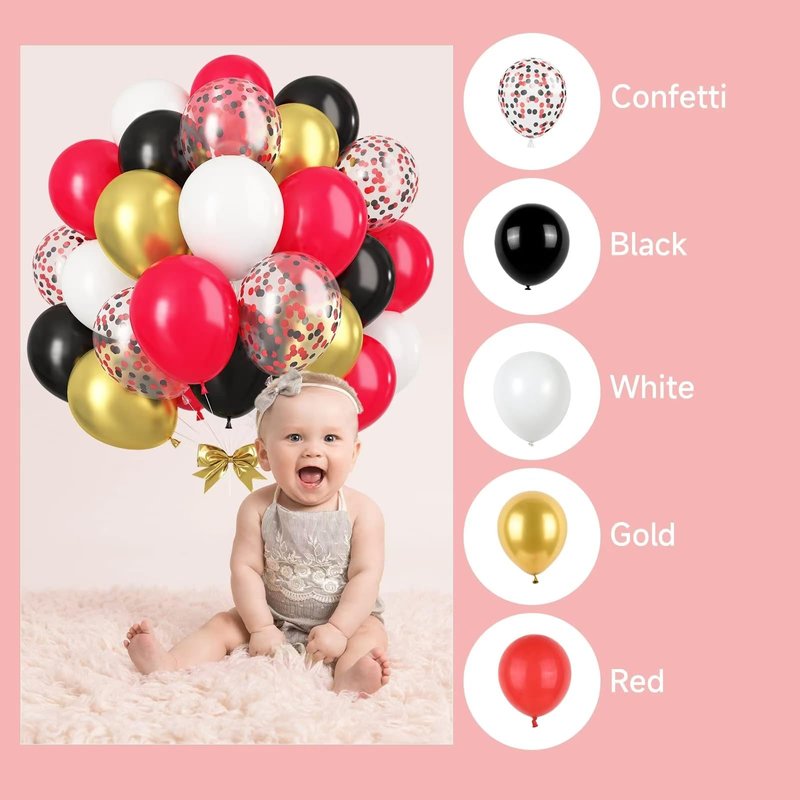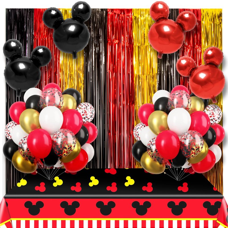 - Package: 2pcs Mouse Theme Tinsel Foil Fringe Curtains, 4pcs 18" head balloons (2 black, 2 red), 2pc 32" number 1、2 balloon/ 1 disposable table cover, 60pcs 18" latex balloons.