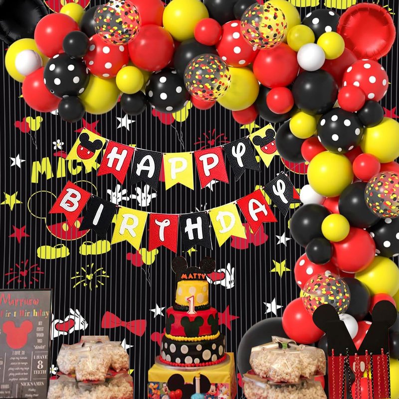 Cartoon Mouse Balloon Arch 125pcs Mouse Birthday Decorations-Red Black Yellow Balloon Garland, Birthday Banner, Mouse Theme Foil Fringe Curtains For Mouse Birthday Party Supplies