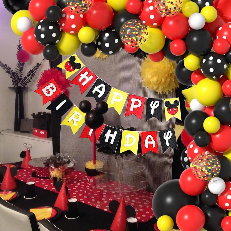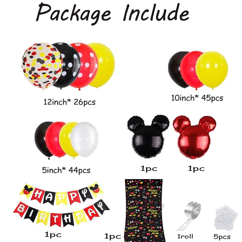 - Mouse Balloon Arch Kit Pack:45pcs 10inch balloons(red x15pcs,yellow x15pcs,black x 15pcs),14pcs 12inch red and black Polka Dots balloons,5pcs confetti balloons, 44pcs 5inch balloons (white x 8pcs,yellow x 12pcs,red x 12pcs,black x 12pcs),2pcs red and black mouse foil balloons,happy birthday banner,mouse theme fringe curtains,5pcs balloon glues and 1 roll chain;