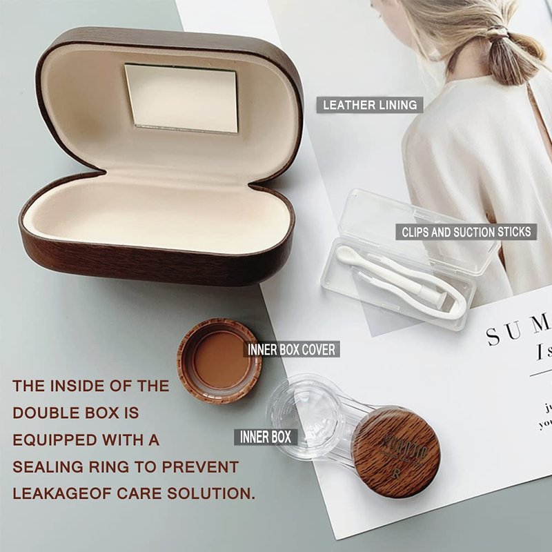 Material: Outer box: plastic Inner box: leather lining Product Dimensions:9.5 x 5.5 x 3 inches; 2.88 Ounces Product List:Out box × 1pc Inner box ×1set Clips and suction sticks ×1set Mirror ×1pc Instructions for use: 1. Please rinse the inner box with clean water before and after use, and do not boil it with hot water. 2. After the inner box is filled with a layer of preservation solution, install the pure lens (note that the lens is placed in the box, and do not place the edge of the inner box). 3. The care solution cannot be washed with detergent or soap. This product is compatible with all brands of care solutions.