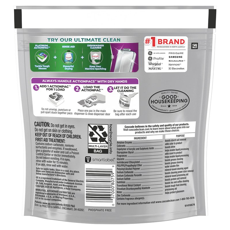 - Cascade Platinum ActionPacs clean 24-hour stuck-on food so well you can skip the pre-wash. This can save up to 15 gallons of water per dishwasher load!