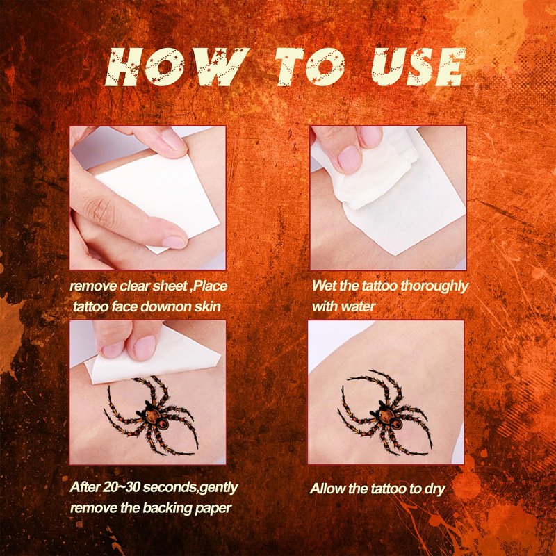 - EASY TO APPLY AND REMOVE-- Our Realistic spider halloween temporary tattoos is easy to use,Clean and dry the skin before application, cut out the desired pattern, remove the clear protective sheet, place the pattern face down on the desired area, dampen the paper with a damp towel or sponge, wait 20 seconds and remove the backing paper and you are done. Easily removed with alcohol, baby oil, olive oil, soap and make-up remover.