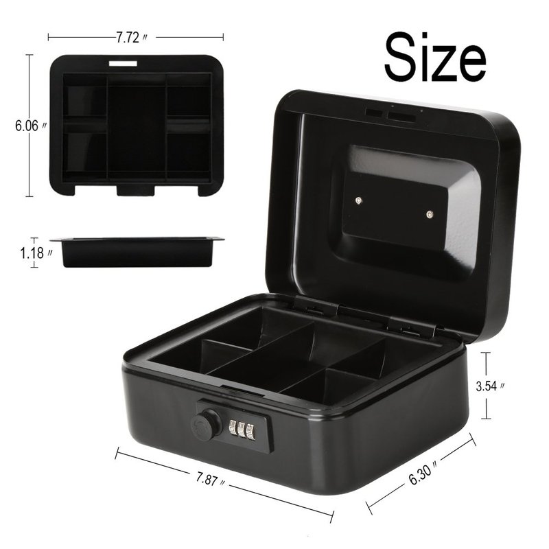 Cash Box with Money Tray, Parrency Medium Money Box with Combination Lock, 7 4/5" x 6 4/5" x 3 3/5", Black