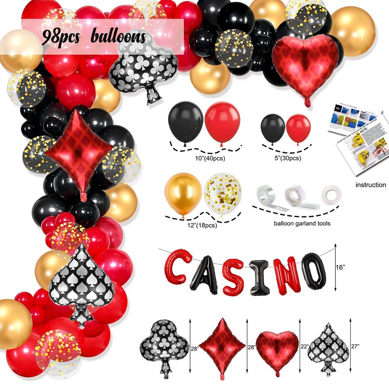 - Package Includes - Your casino night party supplies including: 1x casino happy birthday backdrop, 1x CASINO balloons, 4x poker foil balloons (heart, spade, club, diamond), 16x poker cutouts, 7x casino honeycomb centerpieces, 92pcs casino balloons garland set(88pcs latex balloons+balloons garland strip+glue points+white ribbon+instruction).