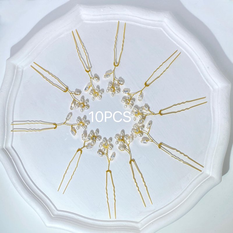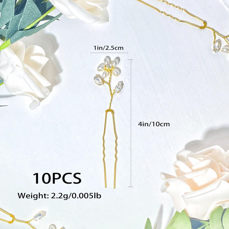 CASOLVX 10PCS Handmade Crystal Hairpin Pearl U-shaped Hairpin Bride Pearl Flower Tiara Bridesmaid Gift Bridal Tiara Accessories for Women and Teen Girls (Gold)