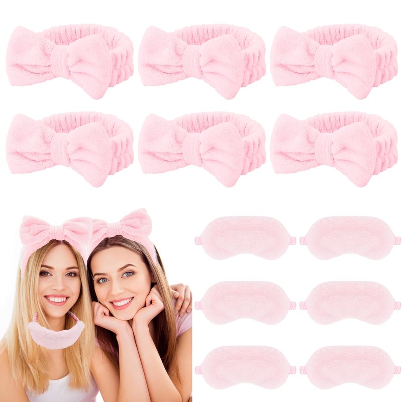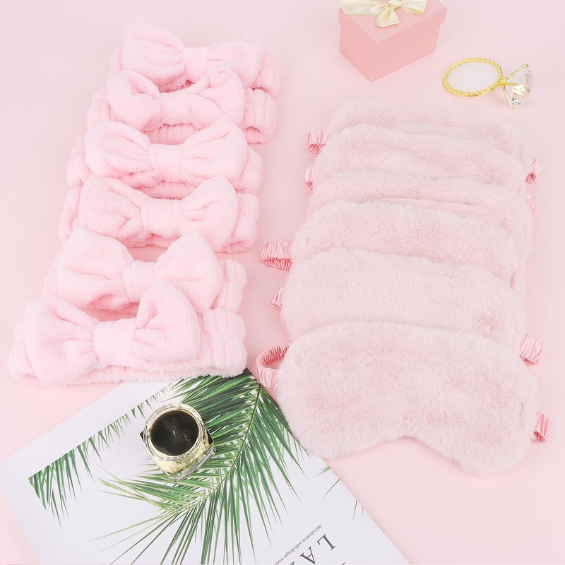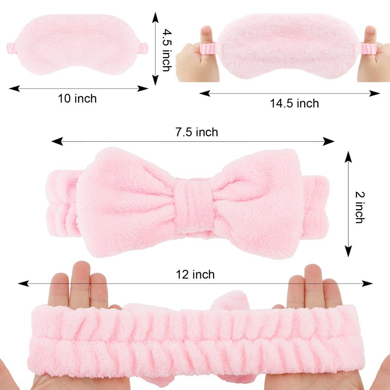 Spa Headbands: The package contains 6pcs pink spa headbands and 6pcs plush sleep eye masks.The bow-knot shape on the top of the headband, makes you extraordinary sweet and cute.