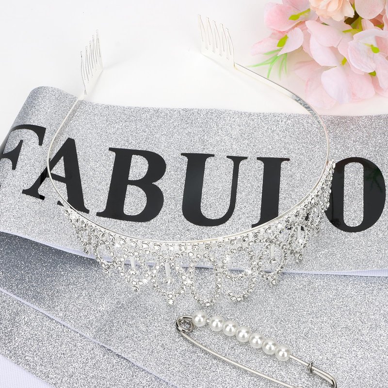 The package contains 1 pcs birthday sash,1 pcs tiara and 1 pcs pearl pin.