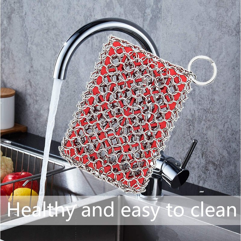 - 【FASTER CLEANING】The chainmail scrubber pad has uniquely designed for a great grip and a tough scrub all at once helps to reduce the chance of scratching your skillet. Any residue can quickly be wiped clean, leaving no marks behind.