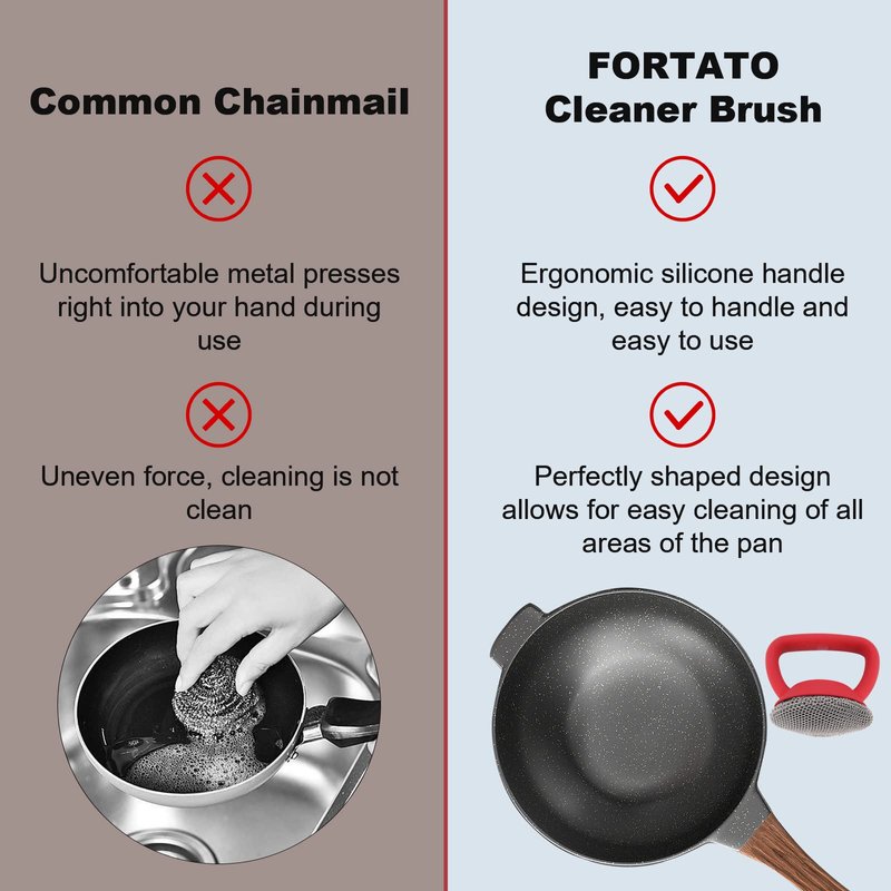 - ⚡️【Innovative Ergonomic Chainmail Scrubber】FORTATO ultimate cast iron scrubber with the ergonomic handle make you feel great and comfortable in your hand. This all-in-one cast iron cleaner can handle even the difficult job in your kitchen without the extra chainmail scrubber, you deserve it! The design of the handle keeps your hands away from the chain during use without worrying about getting your hands dirty.
