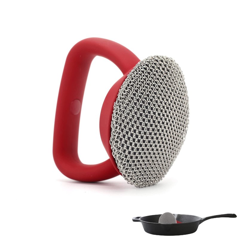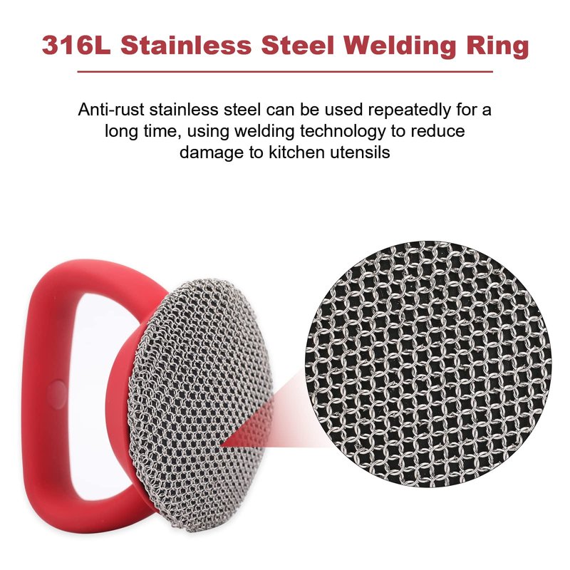 - ⚡️【Say Goodbye to Cheap Cast Iron Chainmail Scrubber】Cast iron skillet scrubber is composed of a combination of silicone and 316L stainless steel, this terrific design combined large cleaning capability. Our cast iron chainmail scrubber will not damage your cast iron skillet/pan nonstick coating. Extend the life of your cast iron pans.