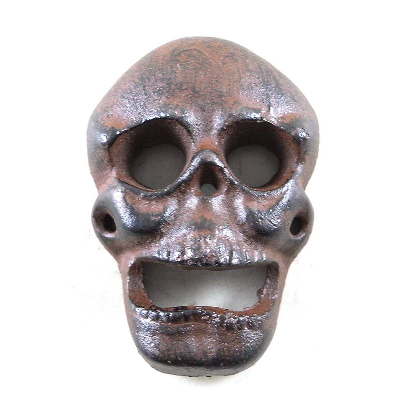 Wall-Mount Skull Bottle Opener Cast iron with our popular rustic brown finish. Perfect for the kitchen, any bar area, the Man Cave, etc. Locate one in your home or outside for parties. Measures 4"H x 2.75"L x 1.25"D 2 screw holes for mounting (screws not included).