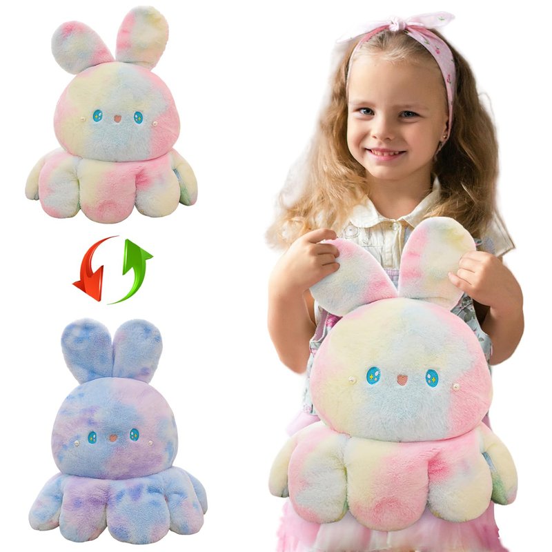 - 🐙Unique Design: This Octopus Rabbit plush toy showcases a design that is both innovative and charming, seamlessly blending the images of an octopus and a bunny rabbit to create a delightful and whimsical look. Adorned with the bunny's signature large ears on an octopus's body, it's irresistibly cute. Even more remarkable is its reversible design, featuring soft plush fabric on both sides, offering two distinct color schemes for a varying visual experience.