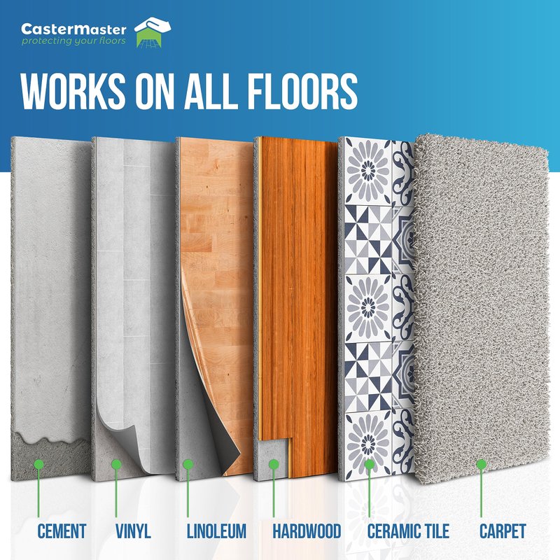 - PROTECTIVE GUARD: What types of flooring can protective guards be used on? Hardwood, vinyl, carpet, ceramic tile, or cement flooring- Caster Master is here to protect them all. Our cups are made with anti-slip flexible rubber, designed to grip your floor and hold your furniture in place.
